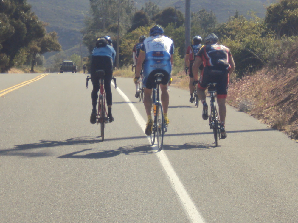 The rest of the group started the climb and I quickly fell off. Cresap joined me while Oleg, Voris, Guido and Geoff rode away from us. I rode plenty on the wheel of Cresap–this really helped me. Rick and Drew blew by me at about 22 miles as they sped to catch the leaders. At the second stop I spotted Geoff getting water so we rode together towards the I-8 overpass. Geoff also let me hang onto his wheel. We saw Denise riding strong right when we got to the highway. Cresap was at the stop right before the descent to Pine Valley so now we had 3 guys heading there together. Right at the bottom of the hill we saw all the leaders coming back from the loop; all except Jim Knight who was now well up the hill on the return leg.