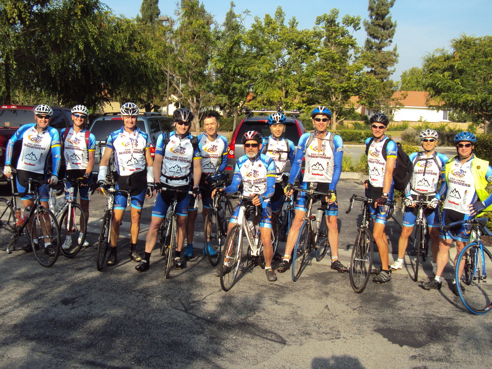 After the racers and support cars went by, we headed down to Baldy Village for water and prepared to ride the 4 miles to the top of Mt Baldy. The group quickly scattered and the pace was slow as we climbed the steep grades towards the top. It was much warmer than planned. Each curve rose up and showed another climb ahead. It took me the better part of an hour to get to the top. We mostly all regrouped at the top, found Bill Wood and John, who were ahead of us to the top. After some indecision on where to park ourselves by descending 1 km to a retail area set up on the side of the road, we climbed back again to the top to watch the race on the large jumbo tron television. We had lots of time to relax in the sun and watch the riders race over the same Glendora Mountain roads we climbed early in the morning. The chase group was caught and Team Radioshack pulled hard to support and protect the yellow jersey of Chris Horner. At less than 3 km from the top, only Leipheimer and Horner were left as they rode away from the rest of the chasers. Great finish.