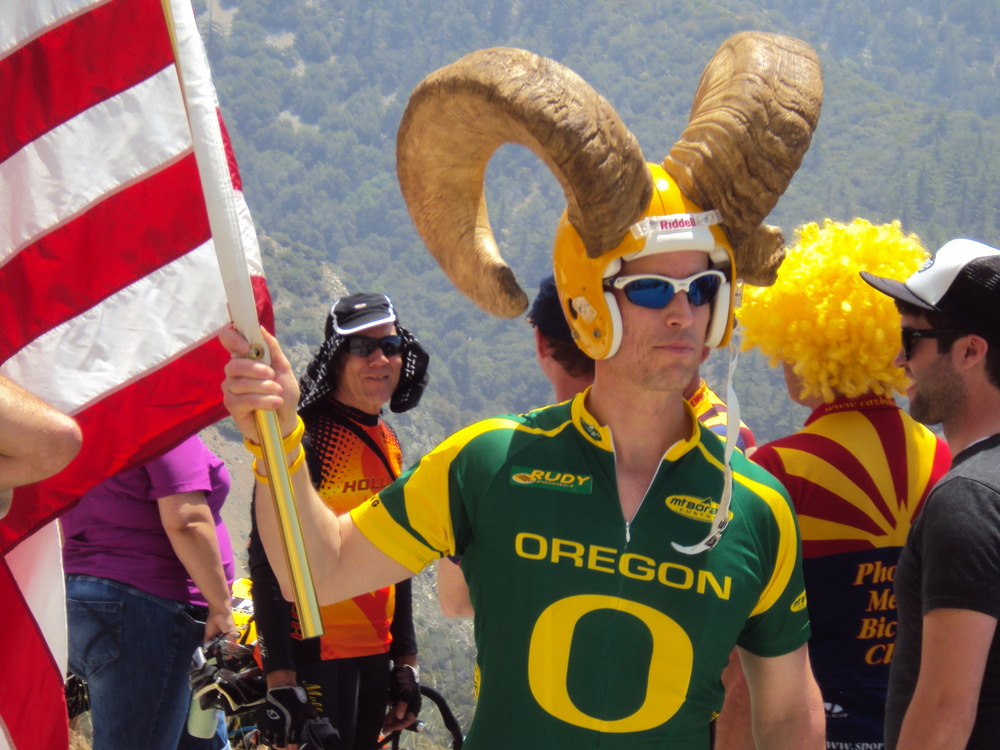 The cops started to close the roads so we had to hustle to get to the top of Glendora so we could see the ToC race go by on their way down the Glendora ridge. This 10 mile trek was mostly up hill for us and took plenty out of our legs. We found a great viewing location overlooking the Mt Baldy road. We put our bikes along one side of the road and had our picnic lunch in the sun while waiting for the race to come by us. The lead breakaway group had nine riders followed about two minutes later by a large group of riders. The pro race started climbing from the start in Claremont so there were riders spread out along the course by mile 12 when they rode by our viewing spot. The scene was busy, crowded and full of excitement. There were hundreds of bike and riders strewn along the road watching the racers fly by, faces in pain as they climbed to the top. There were the usual interesting characters who proceeded to run alongside the racers, including the Oregon jersey guy from Mt Palomar, fun stuff to watch.