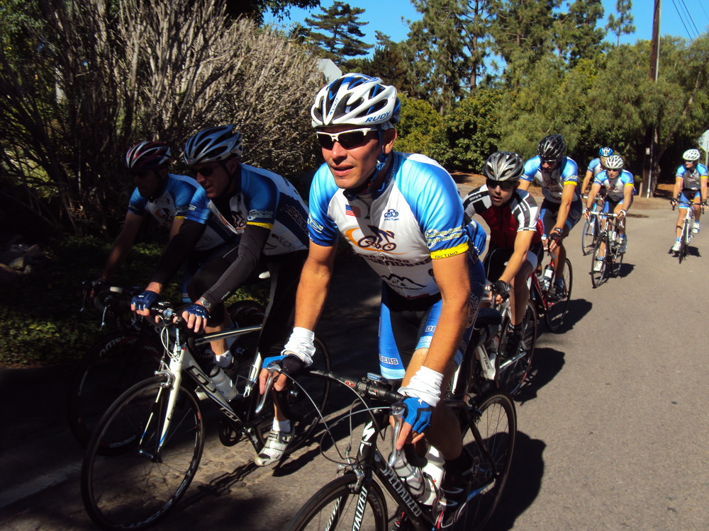 Lots of rides and runs being posted on Strava. Rick is now training with Strava records in mind and he is KOM all over the place. Rick missed our group ride today as he was smokin’ it up the south grade of Palomar. The group was large, we had 15 riders. It was quite cool when we left PQ to head over the casa Voris. We picked up the early guys and pedaled over to meeting spot at Pomerado and RB. Sheehan pulled in just as the group was about to roll and Cresap was late. back at the light as we went towards Lake Hodges. Jeff knows all the short cuts so he met up with us by the mall. Our pace was spirited and down right fast at times during the ride. We motored in a paceline through Elfin Forest; going 28 mph around those curves is a little tense for me. The gang regrouped before the climb up Double Peak. Views from the top were spectacular; another postcard day in San Diego. The pace did not slow down a bit as we made our way back to Rancho Sante Fe and cruised stud loop; lots of pushes to the finish. We climbed up the 3 witches to Santaluz and guys split everywhere from there to get back home. I pedaled back to the bike path and home with 57 miles of riding and over 4,300 feet of climbing.