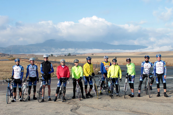 The first to blow by me was Rick as he motored up the hill at a blistering pace. Rick finished 2nd in the timed climb according to Strava, less than a minute slower than our very own Logan Fielder. This was a great time given the strong headwinds we faced and the cold temperatures we hit as we climbed to the apex of the hill. Logan rode his KOM time on 15 Jan 2011, the same date a number of other guys also had top 20 times. There must have been some type of road race that day or large group event that might have helped Logan a bit with his impressive time. The next to fly by me was Keith who was climbing as strong a ever. I looked behind me and saw a group of 4 riders working well and closing the gap on me with each passing curve on the road. I pushed hard to stay in front but the group of Oleg, Voris, Bernie and Bob R sailed past. The winds picked up and the temperatures dropped. It was still a beautiful climb. Guido was next on my wheel and I held him off for a bit before finally losing steam. I finally crested the last rise and saw the guys up ahead regrouping. We put on all our cold weather gear again and heading back towards the cars. The last 6 or so miles back were nice rollers with a descent back to the end of S2. We were all glad to find the cars and get warm again. It was a beautiful day and a fantastic route. It was just about 60 miles and 5,100 feet of climbing. We will have to do it again soon. I took a couple of photos on the descent showing the snow on the mountains. Here are a few photos- Rob