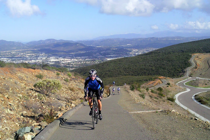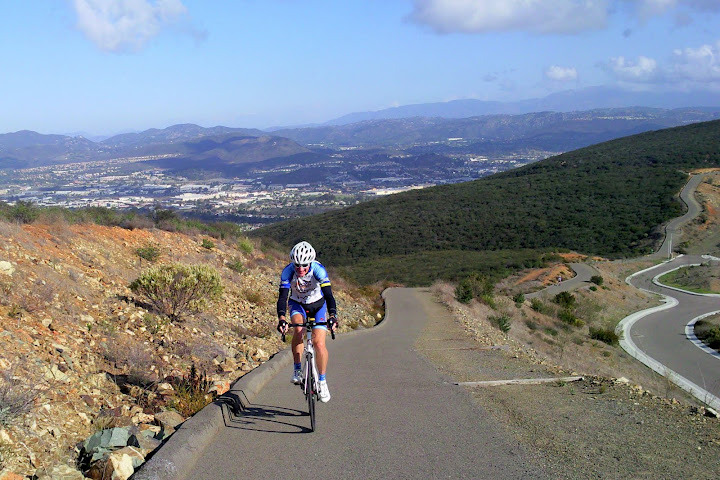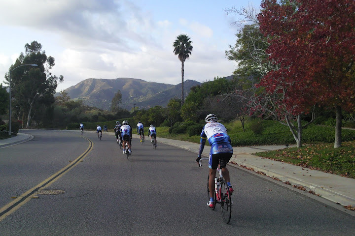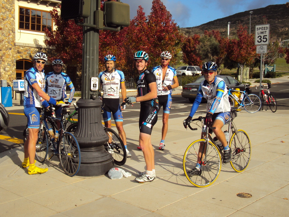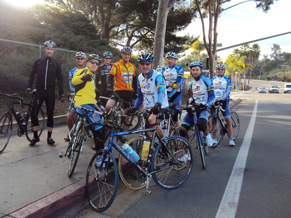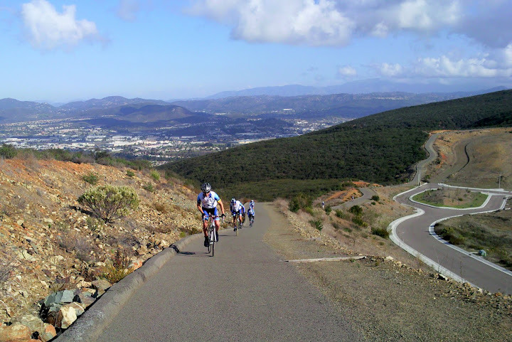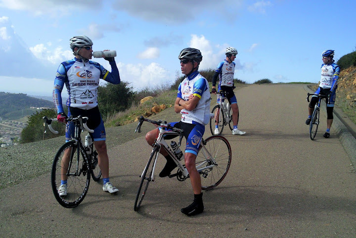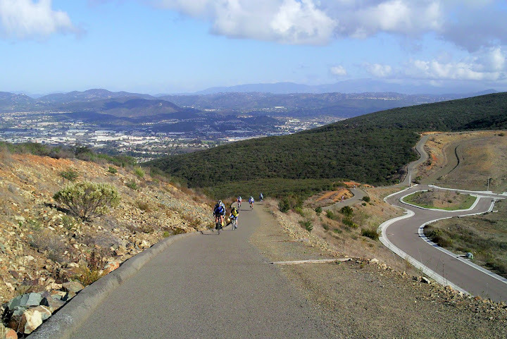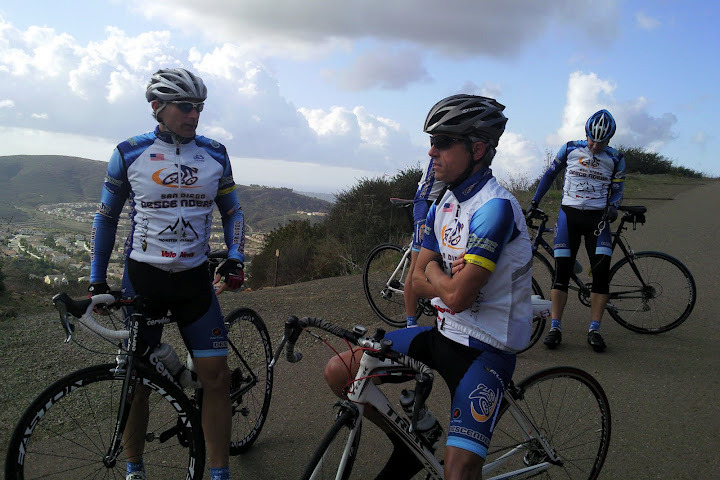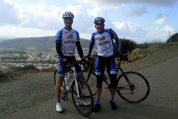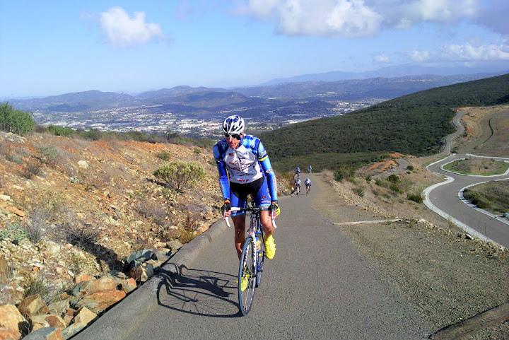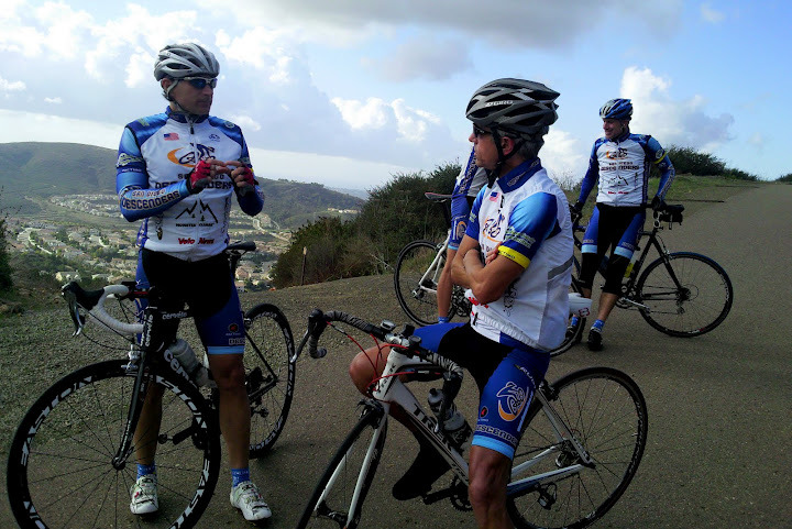 A number of messages have already gone out covering the ride overview. We had a great group ride in crisp and sunny weather yesterday. There were about a dozen guys riding; we even picked up Matt Davis for a few miles with him out on his MTB for a training ride. Mike Farkas brought along a young racer, Kyle, who helped keep the group moving quickly. The pace never seemed to slow as we headed along Pomerado and over the I-15 bridge of Lake Hodges and then towards Harmony Grove. The paceline was not super smooth in Elfin Forest but the pace was pretty quick. I blew up heading towards San Elijo and was the last to get to the little town center. After a quick regroup we all climbed to Double Peak which offered some terrific views. Oleg then took us on a tour of the ridge trails in San Elijo Hills; super steep sections and fun descents. Matt Babb and I climbed over a fence to get back into the neighborhood while a few of the other guys had to hike down a section of path. We regrouped back in town and sped off for Rancho Sante Fe with the usual brisk pace up to Lago Lindo and back towards Santaluz. I again played sweeper up San Dieguito Road and then the group split a bit. Guido and I went through Santaluz and back to the 56 bike path. I finished with about 56 miles and 4,600 feet of climbing; another great team ride and a fun day to be on a bike. Here are a few photos.