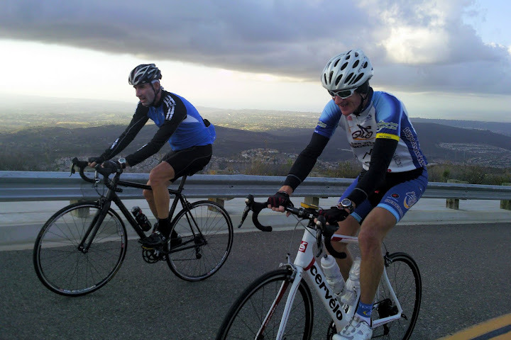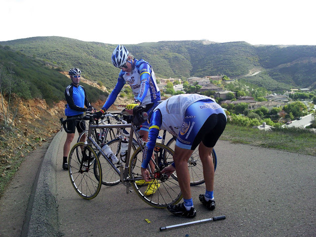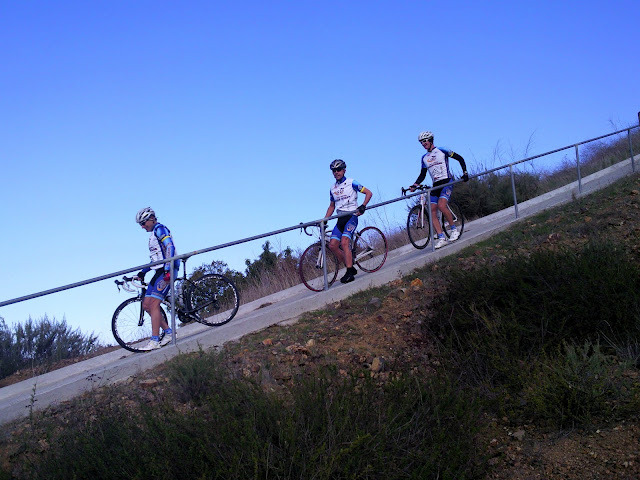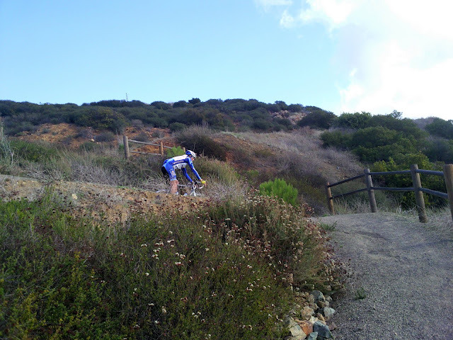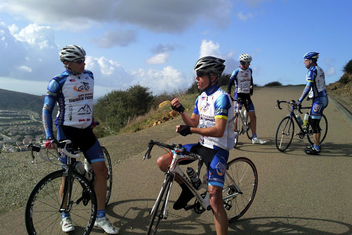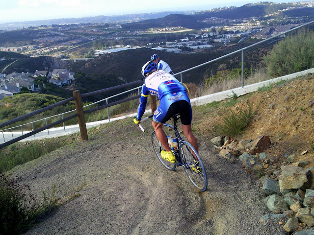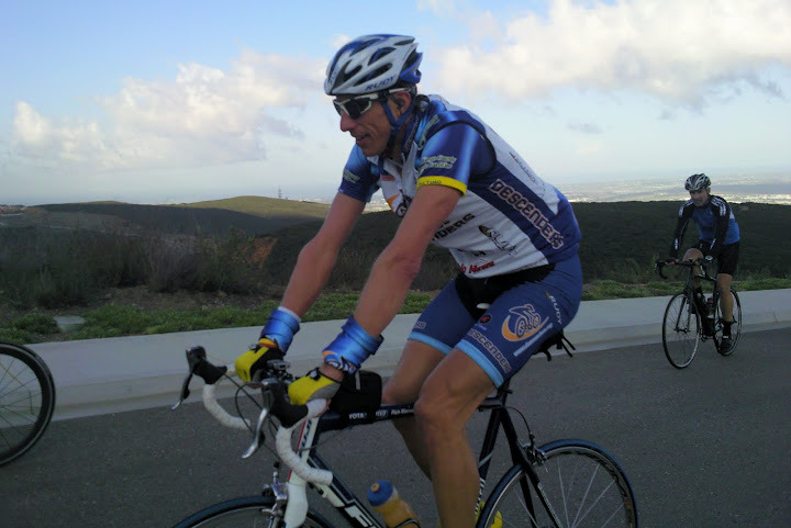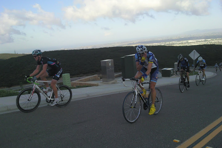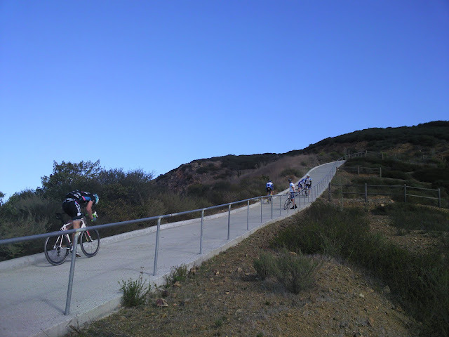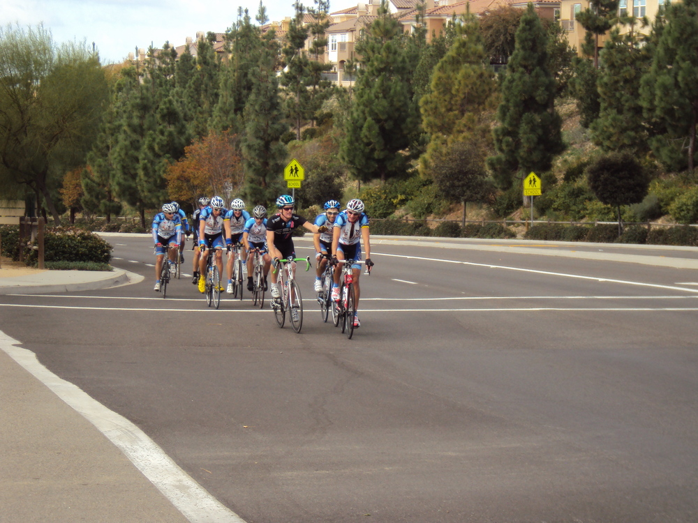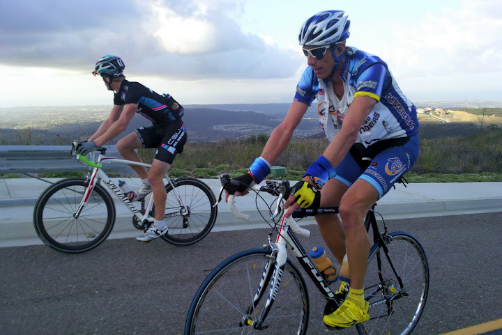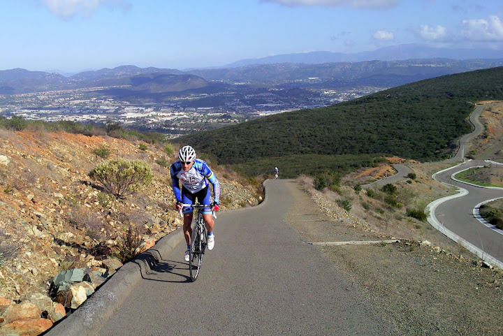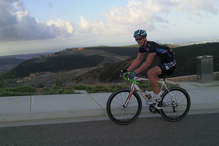 A number of messages have already gone out covering the ride overview. We had a great group ride in crisp and sunny weather yesterday. There were about a dozen guys riding; we even picked up Matt Davis for a few miles with him out on his MTB for a training ride. Mike Farkas brought along a young racer, Kyle, who helped keep the group moving quickly. The pace never seemed to slow as we headed along Pomerado and over the I-15 bridge of Lake Hodges and then towards Harmony Grove. The paceline was not super smooth in Elfin Forest but the pace was pretty quick. I blew up heading towards San Elijo and was the last to get to the little town center. After a quick regroup we all climbed to Double Peak which offered some terrific views. Oleg then took us on a tour of the ridge trails in San Elijo Hills; super steep sections and fun descents. Matt Babb and I climbed over a fence to get back into the neighborhood while a few of the other guys had to hike down a section of path. We regrouped back in town and sped off for Rancho Sante Fe with the usual brisk pace up to Lago Lindo and back towards Santaluz. I again played sweeper up San Dieguito Road and then the group split a bit. Guido and I went through Santaluz and back to the 56 bike path. I finished with about 56 miles and 4,600 feet of climbing; another great team ride and a fun day to be on a bike. Here are a few photos.