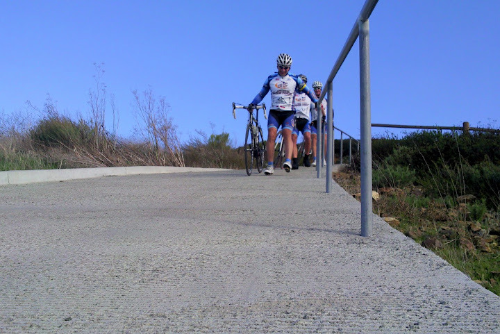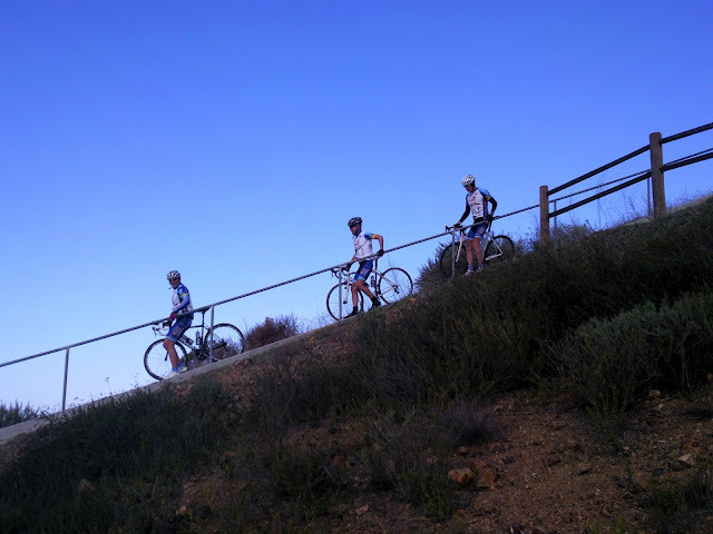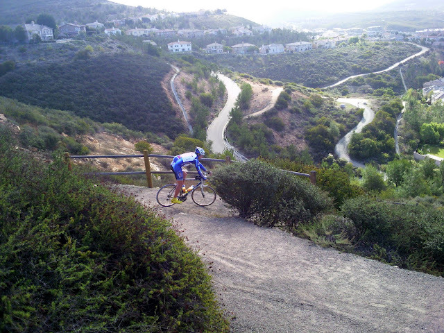 Descenders – We had another great ride today. We rode out to Elfin Forest, did Double Peak and explored some hidden, supersteep (20+% at least!) roads behind Double Peak Park – some of us had to jump over the fence, while others had to walk their bikes down a supersteep stretch (see photos below). Then we went back through Rancho Santa Fe, Santa Luz/56 bike path, for a total of 56 miles, with 4200 ft climbed.