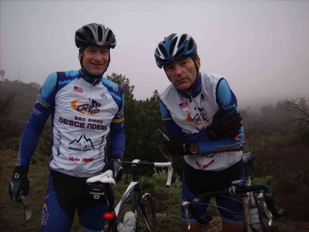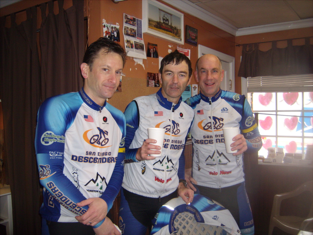 A few hardy souls still braved the rain, cold, wind and overall ugly conditions today. I was not feeling well so I opted to drive over to the meting spot. I sent Voris a heads up message and received back one of many messages noting no riding today due to rain. I loaded up my new bike and was about to leave my house when the rain started to fall hard. I made the strategic decision to swap bikes and use my old Trek. I drove over to Voris’ house to learn that only mike Hodges and Geoff Barrall were riding to Pomerado. I drove over and passed them by the hospital, waving that I would meet them at the start. The three of us pedaled away from the corner and the rains came down. Our feet were soaked quickly and the rooster tails got everything wet and dirty. We climbed HVR and tried to get warm. Geoff pushed the pace as he was the coldest. The rains and wind did not stop as we got to Hwy 67. We cruised along Dye Road and stopped at a coffee shop in downtown Ramona to get warm. Mike befriended some locals while we sipped coffee and wrung out our socks, gloves and arm warmers. Mike and Geoff found some old newspapers to line their jersey for added warmth. Unfortunately we could not stay in the coffee shop all day so we again braved the elements and reversed our course back down HVR to Pomerado.