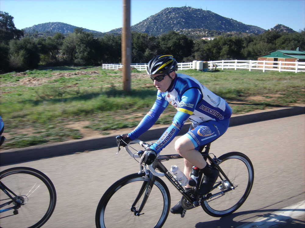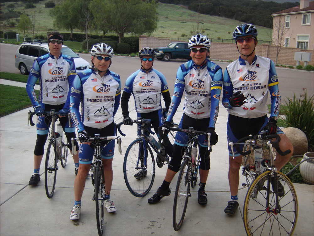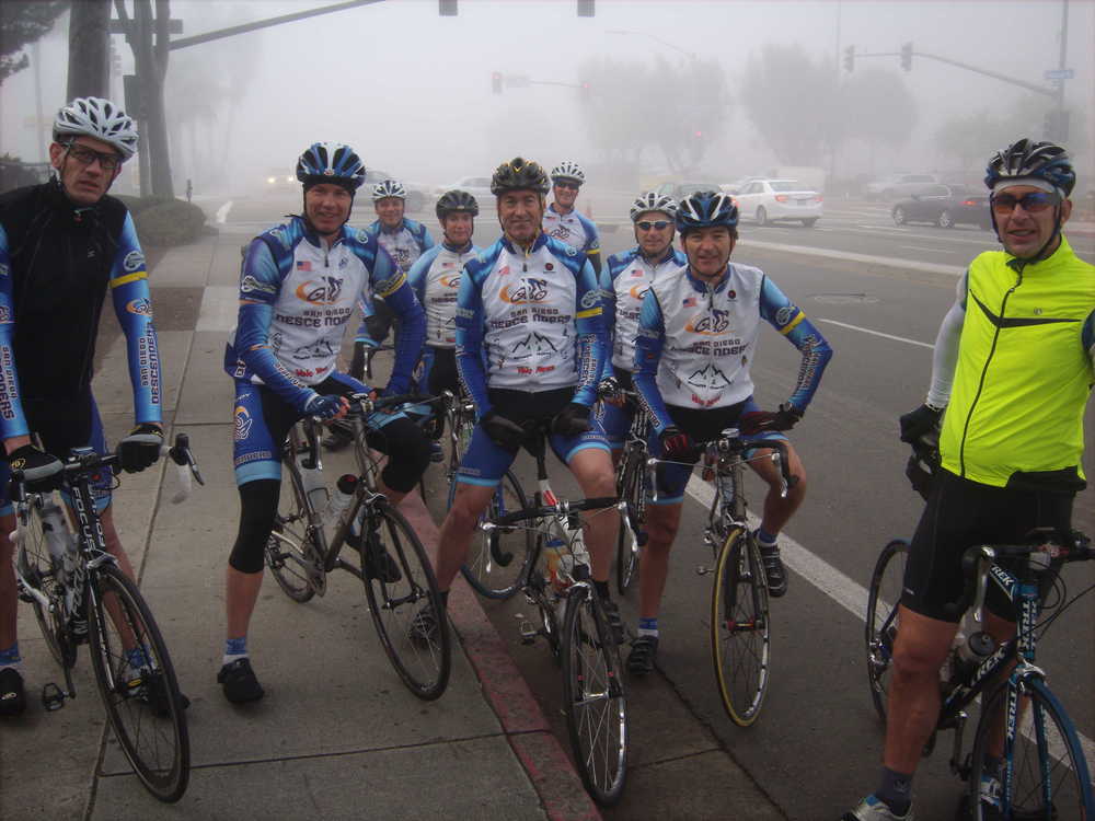 We had a good turnout of more than 10 guys for our Descenders group ride on Sat. We had a couple of guys back after other activities have kept them away from our team rides–Bryan Jones and Matt Davis–both were back and in good riding form. Guido, Bryan and I met on the bike path and headed over to Voris' house. It was cold and cloudy. We met up with John and picked up Voris and Hodges for the ride over to RB and Pomerado. The weather worsened with misty fog growing more dense as we headed north on Pomerado. The group photo shows the foggy start. I am going to have to get a restraining order for Hodges to stay at least 10 feet away from my bike when it is leaning up against a tree or pole. He knocked it over again; 2nd time on as many rides!