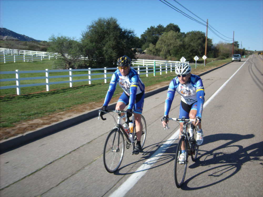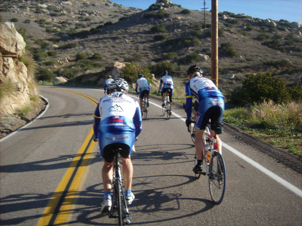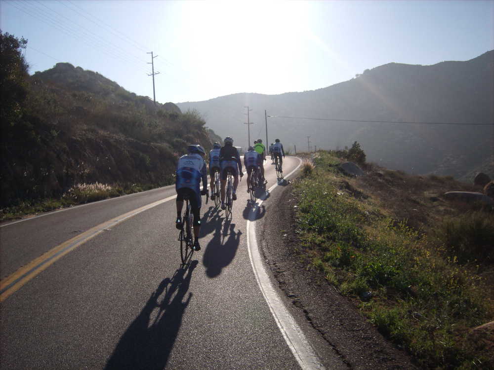 We rode towards HVR with the hope that we could climb out of the fog. The sun tried to break through and as we hit the first climb, the mist was behind us. We had a great ride up HVR and regrouped by the school. I tried to take an action photo on the turn near the bird sanctuary but failed to hold onto the camera and brake at the same time. I missed the cool action shot and had to pick up the pieces of my daughters camera off the rode–no more photos for the ride. Matt waited for me and he pulled me back to the group by the time we hit 67. Bob R had to peel off but the rest of us headed along Dye Road and then up towards Old Julian Road. The pace was again too much for me so I swept up the back but eventually made it to the top. We all descended rapidly and reversed our route back to 67 before taking a water break at the country store. Voris had to motor out quickly so guys split off trying to catch him and regroup. Many of us were back together at the top of the Poway Grade. We screamed down the fast descent to Espola. Bernie and Jeff kept straight while Guido, Hodges, Farkas, Bryan and I went back via Twin Peaks. Hodges left us near Oggi's Pizza and the rest of us returned back to Black Mountain. Farkas continued on the bike path to the coast and got in more than 100 miles. I got home with just over 70 miles and about 4,800 feet of climbing; another great day on the bike.