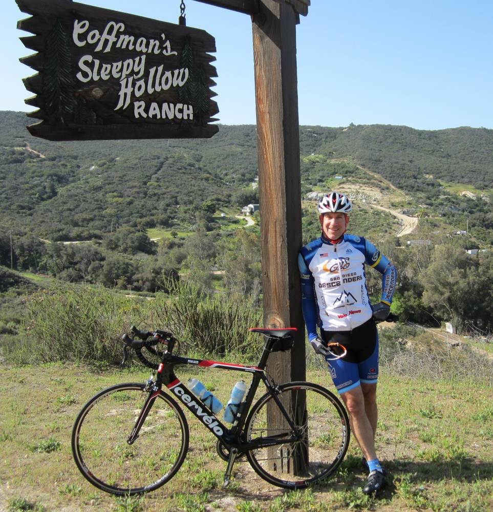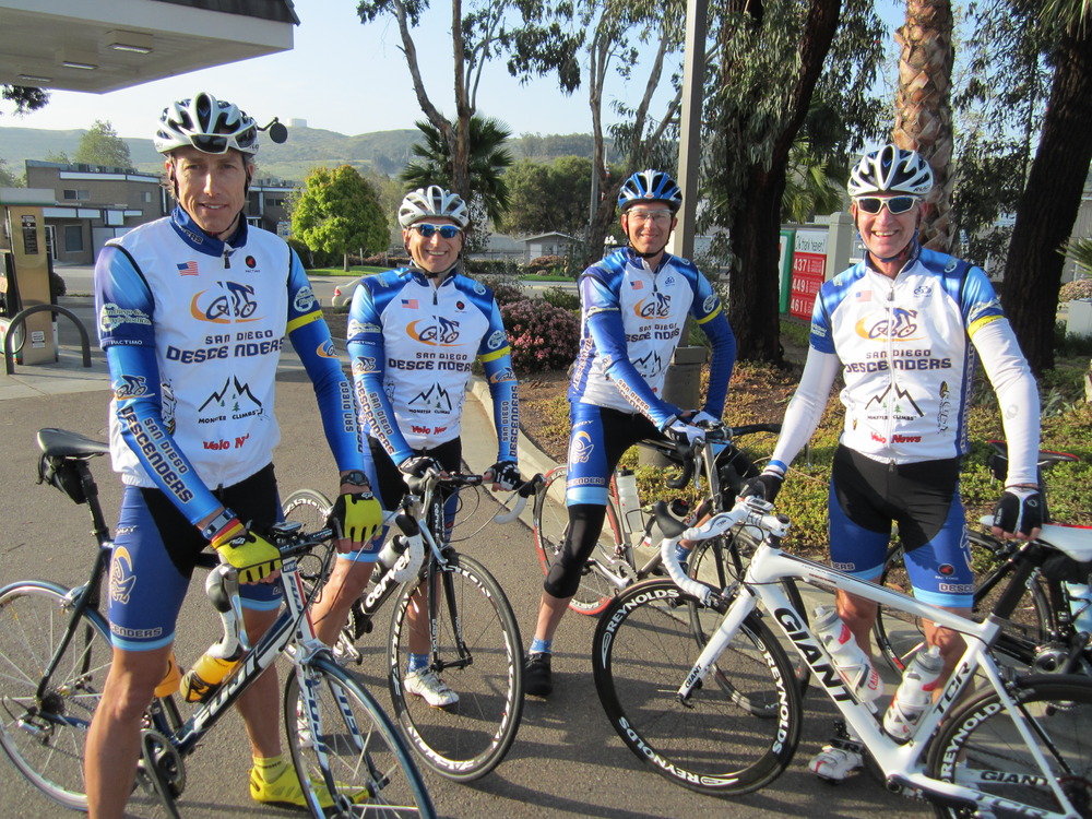 A small group met for the planned ride to Alpine last Sunday. I pedaled alone over to Voris’ house and found Guido waiting in his car. We rode on Poway Road towards Garden Road and picked up Rick along the way. Dave Ernst joined us at the 7-11 store. I looked around and saw only those four guys and me. Those of you with a short memory may not remember that these four guys were Team A of the 2009 Stagecoach 100 mile Team Time Trial! As a perennial Team D member and honorary team captain of Team D, I could tell I was going to be in big trouble for this ride.We took an easy pace up SPP and I stayed in the back while the old TTT team did a nice pace line down highway 67. We rode over towards Lakeside and met up with Neal. Great, another fast rider. I held on but was hurting. There was a potty break needed after we crossed under I-8. I took the opportunity to head out and get a little lead on the boys. They caught me well before the descent of Dehesa. Guido was feeling the effects of the hard ride from Oceanside the day before so we decided to head towards Alpine and meet the guys as they climbed back up. Guido cut through on a new route called East Grade Road. It was a nice climb up and connected to Tavern Road off the climb. We descended a bit and stopped for a photo before we saw Voris and Ernst coming up fast on the climb. Guido and I tried to stay ahead of them but they caught us quickly. Rick and Neal came up fast too. We all regrouped and headed back down East Grade.The gang did a water stop at the 7-11 near Lake Jennings. Guido and I head out early and hustled towards the 67 climb. Rick caught us first, followed by Voris and Ernst; Neal went back another route. Voris got a flat so we fixed his tire. We met up with Cresap who spotted Rick gaining KOM points on the 67 climb. Cresap rode down 67 to mete us and then climbed back up to the SPP light. We all headed down SPP and then back to Voris house. I had 63 miles and 5,500 feet of climbing.Good day and fun weekend of riding.Have a great time on Dudley’s Dream Ride.Rob