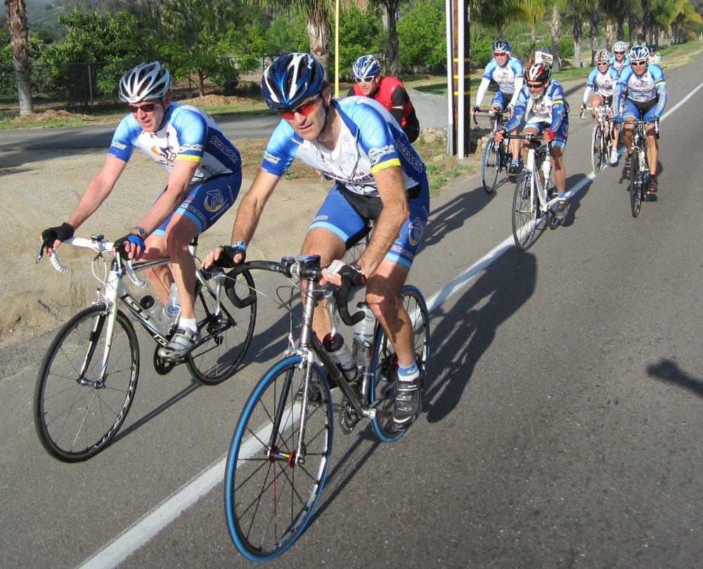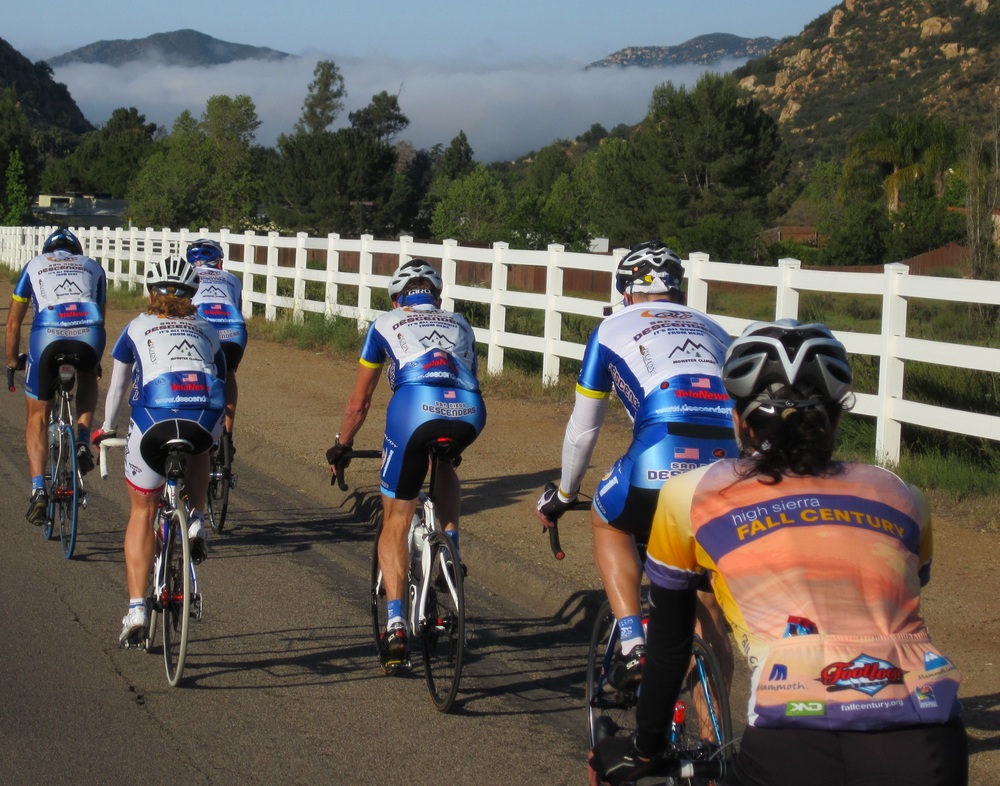 Descenders were riding all over the county and southern CA yesterday. We had a good turnout for the Alpine Challenge with a dozen riders wearing Descenders jerseys. This is the 7th year we have had a group out for this exciting ride in the mountains of east county. We all rendezvoused at Summers Past Farms about 7 am in a bright sunny morning with great riding temperatures. Most of the "Team A" riders were missing so we planned a less competitive group ride, hoping most would hang together. Things started well as we pedaled over to Harbison Canyon and the fun descent down. Cresap was on point for the fast descent as the speed broke us up a bit. We lost Denise and Amy on the final parts of the descent but still had a large group start the Dehesa Road climb. I could tell Neil wanted to go faster so I reviewed the route with him, noting that getting lost is almost impossible. A few miles into the climb, Neil took off and quickly disappeared off the front. The remaining group of 8 riders–Jeff S, Eileen, Len the Elder, Jeff C, Mike, Bryan, Bernie and me cruised up past the Tavern Road return route and kept climbing towards I-8. It was great to see Bernie out riding again, he made a fast recovery from his shoulder injury on the Couser Canyon fall. He looked like the same strong Bernie of old. The group passed many riders on our way up and kept a steady pace to the top. Len the Elder was on fire as he pulled to the front for much of the climb. Neil blitzed the 17 mile climb in 1:09, top 4 of Strava entries. The rest of us hit the top in 1:22, with Hodges a second faster than Bryan based on the ever important Strava rankings. We passed Barb and a group of her riders just as we went under the freeway. She excitedly described the Descenders riding club from her ride with us to Oceanside last week to her other riders as we cruised towards Old Hwy 80. Just before the SAG Stop as I was on point with Barb, I heard someone yell "flat". Apparently Hodges got a flat but I was too distracted in front to stop. Bernie and Len stopped to fix the tire with Mike. Bryan , Eileen and Jeff S stopped at the SAG while I kept pedaling with Barb towards Guatay. We climbed in a small group with the energetic and infectious enthusiasm of Barb reflected in all the hoots and hollering she gave when we passed other riders. I was pushing to keep up with her while it looked like a "walk in the park" for Barb. At the top of the climb in little Guatay I said good-bye and sped off on the descent for Pine Valley. I made quick work of the mile plus descent down towards the lollypop loop of Pine Valley. I spotted Neil, now one of the lead riders in the race, starting his climb back up. He was now 4 miles ahead of me and motoring fast. I assumed the group was back out riding and closing the gap quickly. I sped along trying to keep the small breakaway for as long as possible. Just before the turn in Pine Valley to loop back I was passed by a flying Drew Peterson with his usual camelbak water source on his back as he effortlessly cruised at 25 mph speeds. Drew finished the ride in 2:57; I never saw him again as he motored out of sight. I sped through the neighborhoods and back to the climb out of Pine Valley. The main group of Descenders had already passed but I did see John Moran on his descent. The climb up hurt as I was still riding solo and the winds picked up a bit. I needed some nourishment so I did a quick stop at the SAG and grabbed half a banana and two fig newtons. There had been a guy on my wheel on the climb from Pine Valley that took the turn to Descanso ahead of me so I tried in vain to go catch him. There were only a few riders on the road and I rode mostly alone back to the freeway where the first of the leg cramps started to hit me. I was only at mile 42 so I knew I had to back off my pounding of the pedals a bit to find a way out of the leg pains. The descent back down Japatul Valley Road was fast but I knew my speed was dropping. I tried to push my pace as I passed a number of riders returning on the 50 mile route. The legs were not willing no matter what I tried to do. The cramps caused me to slow again as I took the turn onto Tavern Road and slowly make my way towards Alpine. Thankfully I was passed by Mike, Len and Bernie on the climb. I pulled back up to them and hung on as we rode along Arnold Way and the final 6 miles of the ride. The four of us finished together in 3:45, well behind Drew and the pace of Neil who finished in 3:20 despite having to fix his own flat tire. We covered about 100 km with almost 5,800 feet of elevation gain; another great Alpine Challenge ride. We relaxed at the tables enjoying our lunch of pasta and burgers as the rest of the Descenders finished up their ride. The last stop was to the beer tent area for a cold beer, salted nuts and a few more riding stories before we all headed out for home. Attached are a few photos from the ride. Look forward to the ride again next year. ride on- RobRide Schedule