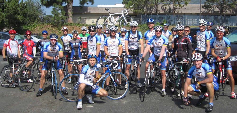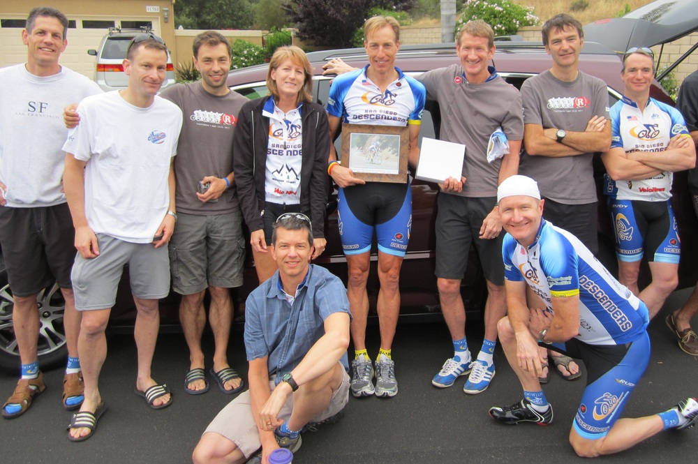 Stage 7 of the Tour of California finished in dramatic fashion with Robert Gesink attacking on the final climb up Mt Baldy. Two riders, Chris Horner and the Columbian rider, Atapuma, were the race leaders for much of the day. The initial breakaway was led by Jens Voigt and riders from Radio Shack. Coming up the final climb from Baldy Village, Horner and Atapuma still had a 1:33 led over the peloton. Atapuma attacked and got slightly away from Horner. Gesink got to the front of the group and attacked up the final five kilometers. He passed Horner and then passed Atapuma at top of climb, just before the switchbacks. They both fought to the finish with Gesink winning the stage and taking the Yellow jersey from Zabriskie. The Descenders were there for the epic ride, the great race and were watching 200 meters from the finish to watch Gesink take the stage victory and ultimately the Tour of California win. The group event started at Casa Voris where we all gathered for the drive to Glendale. We handed out the new Descenders jersey to Bernie Bogard for making such a speedy recovery from his fall on Couser Canyon. He destroyed his jersey on the fall, not to mention his shoulder, finger and all the road rash. Bernie is back and as strong as ever. He will look good in his new team jersey. Dave Ernst and Dave Sheehan presented Rick with his award and framed photo of his great record ride up the south grade of Palomar Mountain; the first Strava confirmed climb of under one hour. Great riding Rick. A few of the boys who could not go to the Mt Baldy ride stopped by on their way to the local group ride. Guido, Sheehan and Farkas headed off to Mussey and Pamo while the rest of us drove to Glendale.