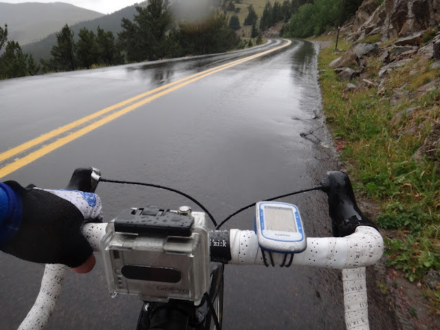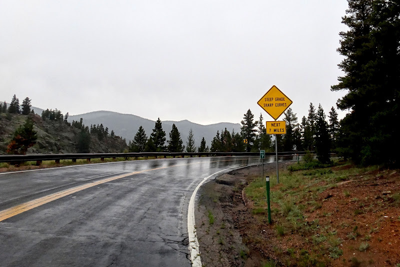 When I checked forecast, it claimed temperatures around 50F at the summit and 20% chance of showers in the afternoon (typical for Denver), with hourly forecasts predicting showers from 2PM to 6PM. I started riding around 10AM and with 3 hour climb and 1 hour descent I figured I may just be lucky enough to escape them.