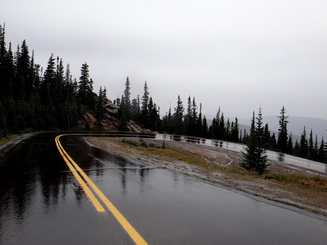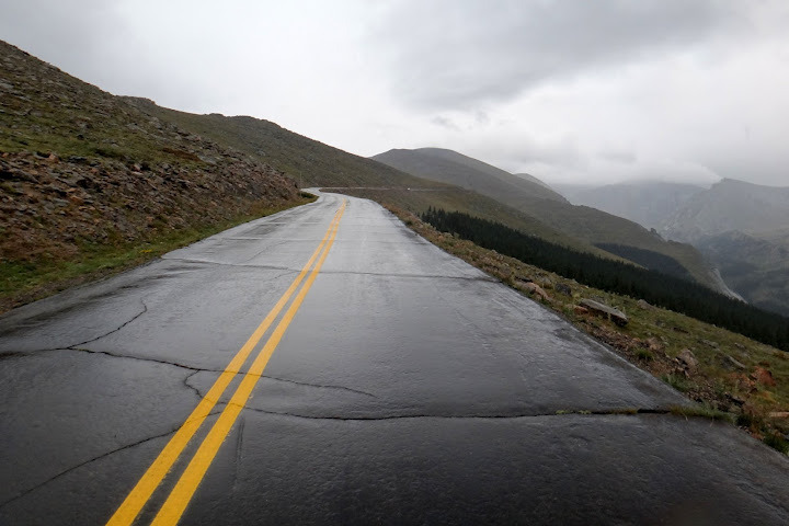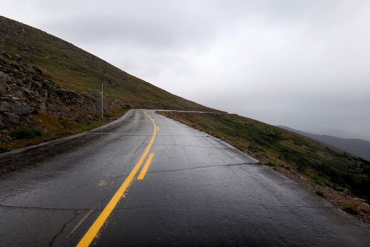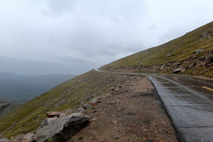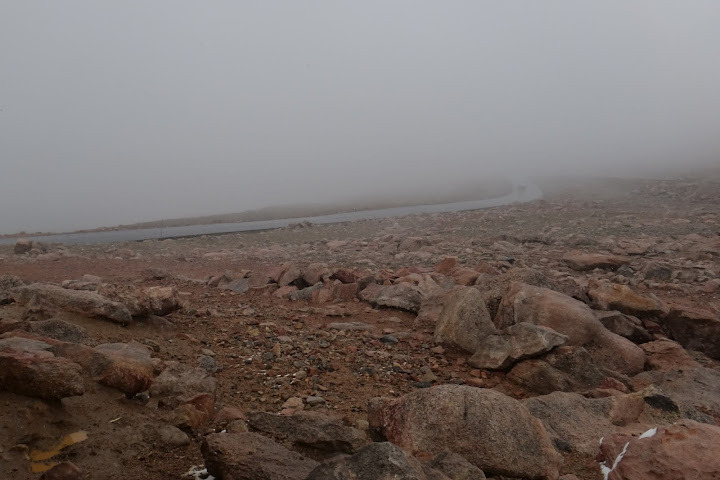 With about 3 miles to the summit the rain turned to snow, with some mixture of hail-like particles that I could see bouncing from the wet road. Wind was brutal too. Visibility was almost non-existent, so no good photos unfortunately – on a clear day one can see Pikes Peak and even curvature of the Earth from the top of Mt. Evans. My hands were freezing, despite my full-fingered gloves.