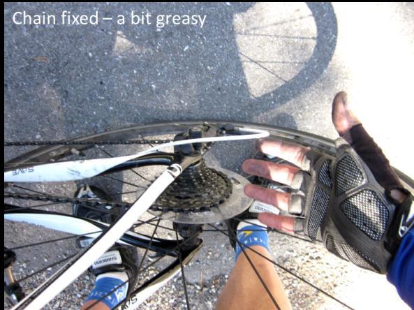 I headed back into the town and swung by the bike shop. The mechanic adjusted the low limiter on the front derailleur and also spent some time adjusting the tension on the rear derailleur. I was a bit puzzled with the rear derailleur adjustment, since it had been working reasonably well. I headed off to the main climb of the day. As the slope began to pitch up a little heading out of town, I noticed the rear derailleur was shifting poorly. Rather than going back to the shop or attempting a fix on the road, I just adjusted the tension a little from the cable and it began to work a little better. Soon I was heading up Mt Norquay and encountering the longest sustained pitches of the day. The shifting was still a bit troublesome, but the views of the Bow River Valley were so amazing that I decided to keep riding. At one point the slope became steep enough that I was looking for one more gear. I began to shift to a larger cog on the back, and as I did so I looked down. Oddly, it looked like I was on the largest cog already, but the shifter was moving. Before I could react, the chain came off the largest cog and went straight into the wheel. I stopped pedaling, immediately realizing I was going to be jamming the chain hard between the cassette and the spokes. Regardless, the chain did jam, and the bike came to a sudden halt, requiring some quick foot work to avoid falling over in the middle of the road. Safely off the bike, I looked down to see the chain firmly wedged behind the cassette. This was pretty annoying, since I was making good time up the mountain and hoping I might actually have a chance at a top 10 for the segment (reviewing the climb later, it became obvious I wasn’t even close). The next 10 minutes were spent getting progressively greasier as I worked to pull the chain out. The alternative would be to walk back down the mountain, since the rear wheel was not going to do a lot of free wheeling. The chain finally came free, and I did my best to clean up my hands with dirt and leaves. After properly adjusting the tension on the rear derailleur cable and