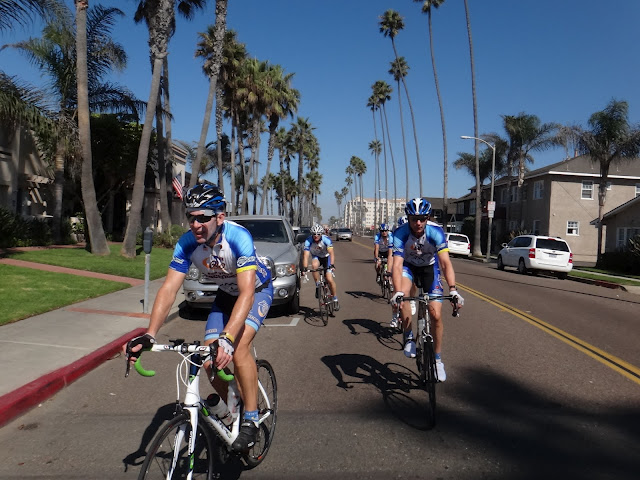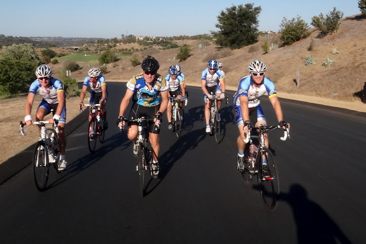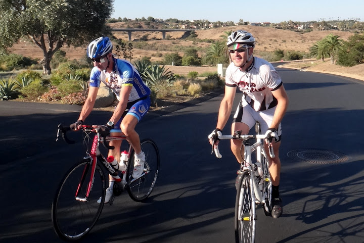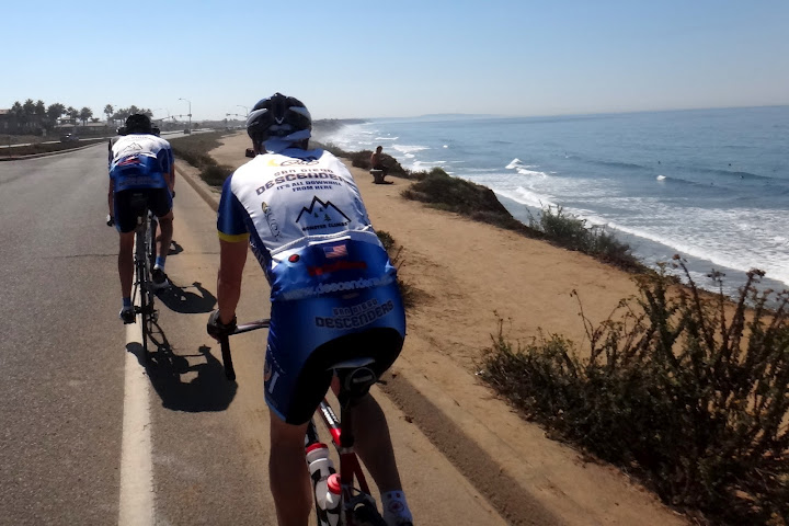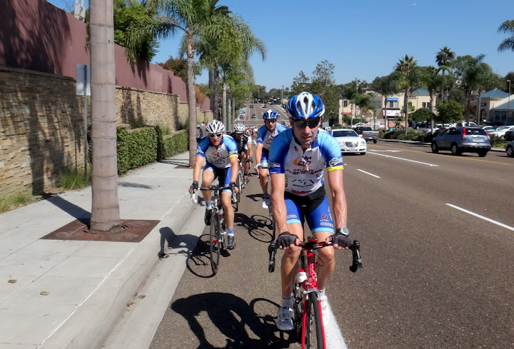We picked up several "free-loader" riders while riding along the coast who hung on with our group – they made things a bit dicey a few times. Jeff lead the group out for Oceanside Harbor sprint, holding 29 mph for what seemed to me (as I was desperately trying not to get dropped) to last forever. At the final turn Matt jumped to the front, while Chad and I followed. I tried to sprint by Matt, who obviously was taking it easy, but he got on my wheel (along with Chad), and outsprinted me at the line. Nicely done, Matt! Of course strava says we were tied for KOM, so next time you have to try a bit harder, Matt! Descenders now have top 5 spots and 9 out of top 12 spots on that segment.