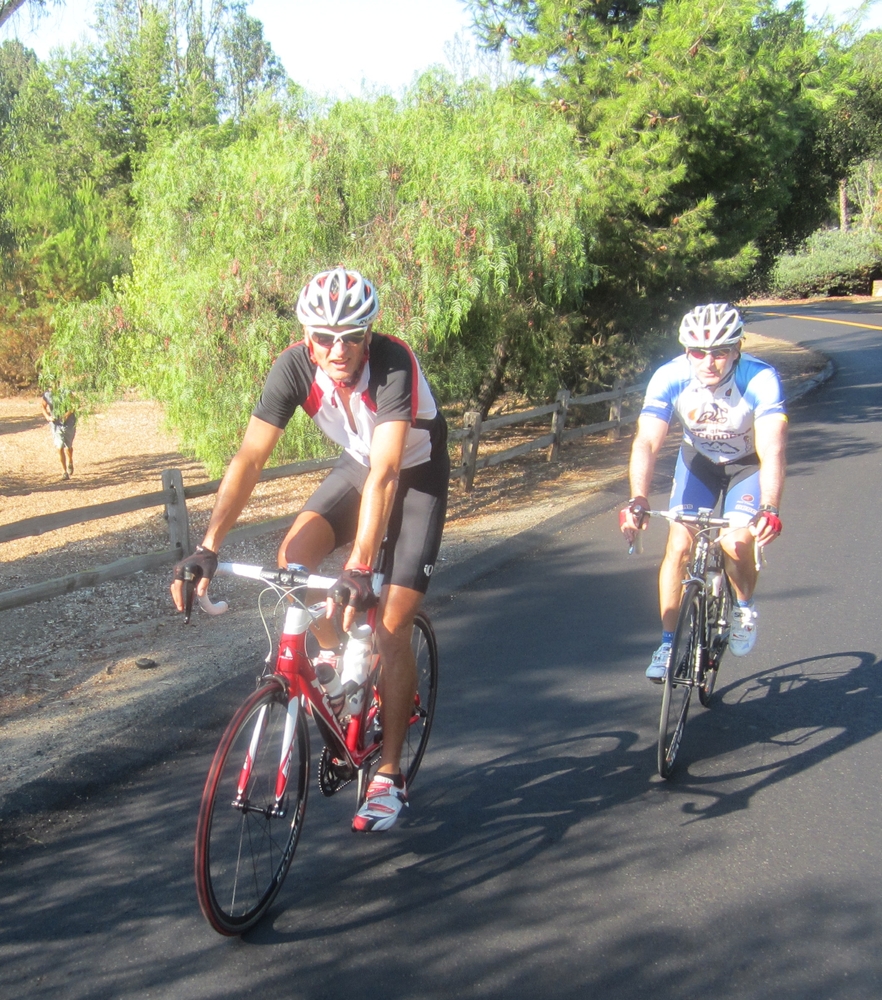 We decided to loop the golf course and came out near Lago Lindo to start Stud Loop backwards. After a brief sprint through Stud Loop we cruised down toward El Apajo. We spotted Garet climbing up Via De La Valle as we left RSF. He was out on his Sunday cruise through the county. Bob continued to pull us to 3 Witches and then we cruised to Santaluz lower loop. Bob peeled off for home to pack for his business travels to Athens and Bologna. Guido and I cruised back to the bike path.