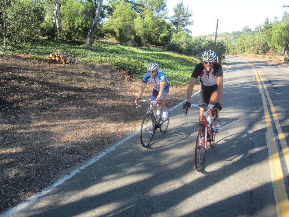 This was our last chance to really burn up the legs before Tour de Poway. We had a great Descenders group ride on Saturday so we decided to hit the coast Sunday. I thought I coordinated a group ride to meet on the bike path at Camino del Sur at 8 am. I pedaled over and met up with Guido and Bob Proulx. Bryan Jones and Jeff Cresap were maybe’s so when no one else arrived we decided to head west on the bike path towards PCH. I unfortunately had mentioned to Mobil station/Circle K store and found out later that Jeff and Bryan were waiting for us there. We did not connect and they rode a loop west and up El Camino Real to the Three Witches.