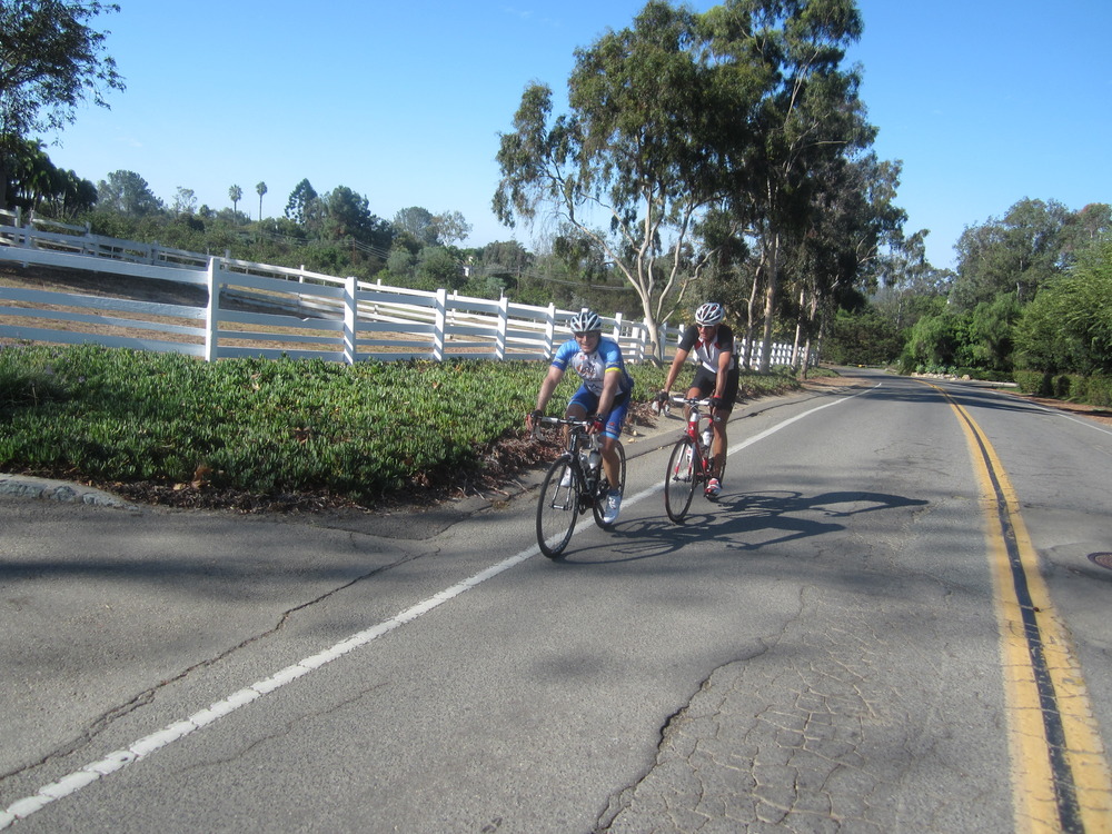 Guido, Bob and I pedaled into the fog heading towards Torrey Pines. We climbed up the Carmel Country loop and back down towards Sorrento Valley Road, cutting through back towards Carmel Valley Road. Unfortunately the bridge heading to TP was closed to all traffic so we just went north on PCH. We rode to Loma Sante Fe and then back east towards Rancho Sante Fe. The fog had cleared and the bright sun started to warm the day. Bob was on point most of the time until Guido led us into RSF.