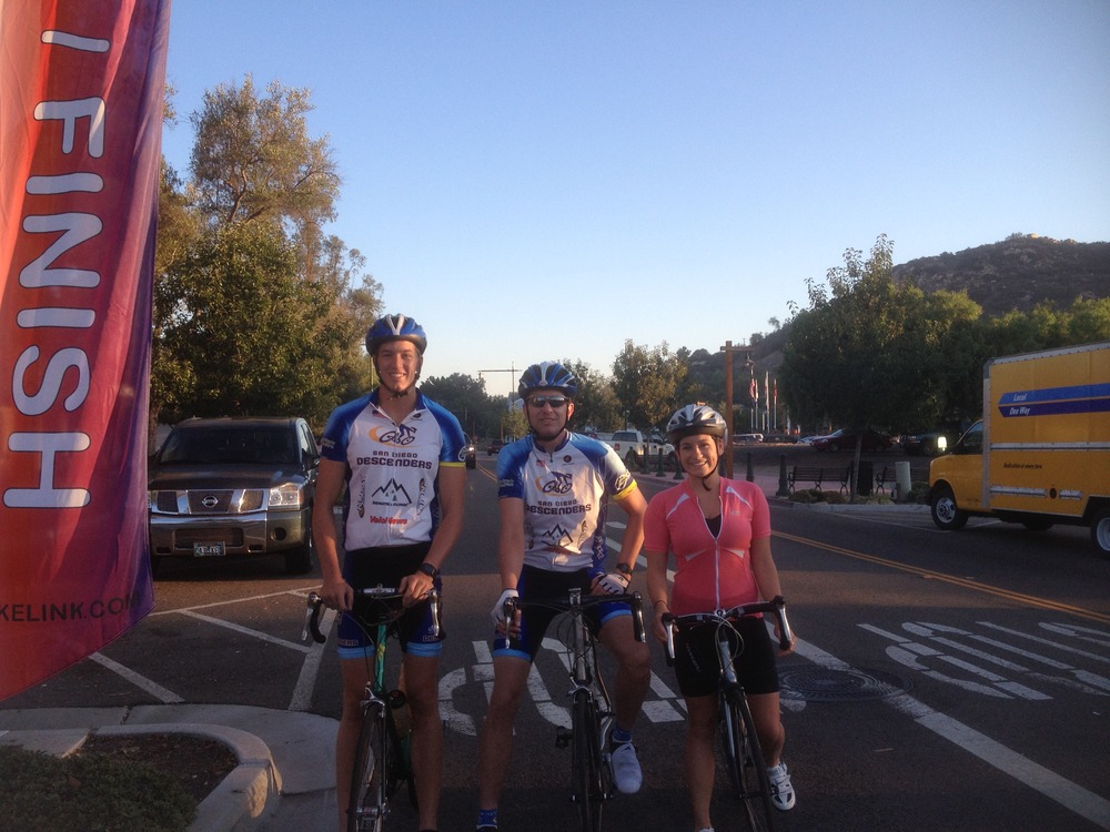 Ernst was resting in the shade by the time I finished. He had pulled the hogwash ride of the day earning KOM awards on the Ramona Grade descent at the lead of the race and then going on a 26 mile breakaway before getting caught by the race leaders in RSF. Great riding Ernst. Len was a super stud all day. He rode with the second group while most of us fell back and finished very strong. Claus made up time after his flat with a super effort to finish just a bit behind Hodges. Claus saw Geoff B on the route as well so all recovered from the flats. There were other Descenders with flat tires. Matt got a flat along La Costa and still finished in the top 5 riders. Bob R got a double flat at mile 92 and Chad stopped to help him. They quickly fixed the tires and finished in 3rd and 4th place for the ride. Strong riding from the “A” team guys. Voris and family rode a strong 100 km event averaging about 17 mph and getting passed by no one the entire ride. All the Descenders finished the ride they planned, great team effort and good showing.
