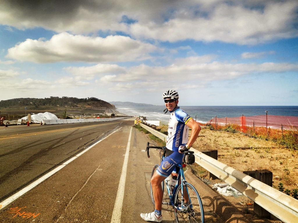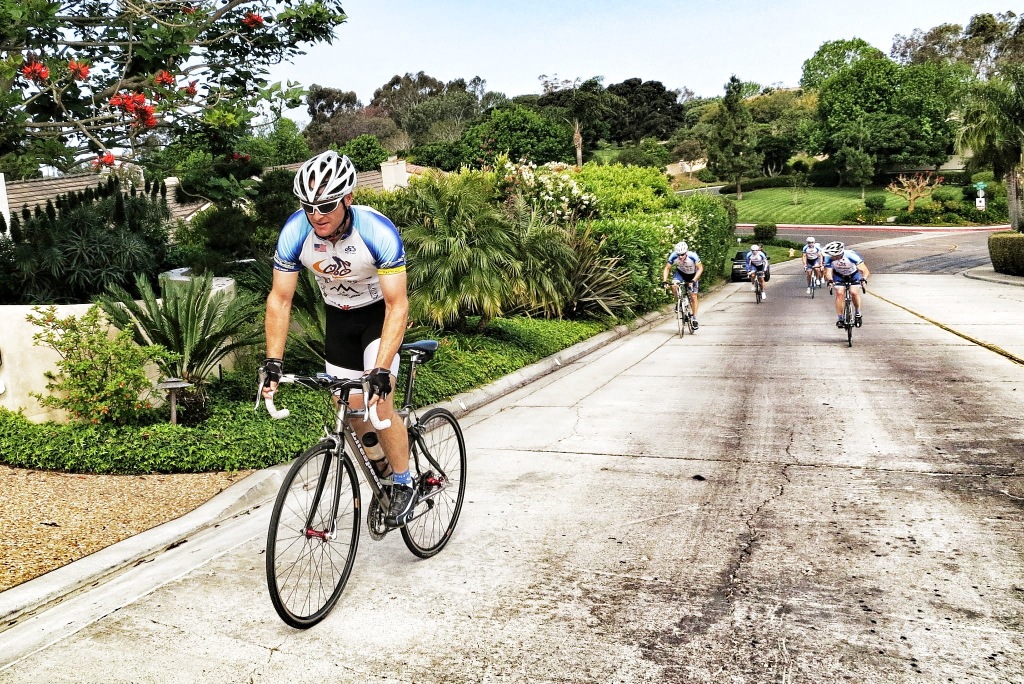There was some construction on Torrey Pines as we approached La Jolla, which was annoying (as cars took over the bike lane). As we hit Hillside, Rick picked up the tempo and Larry, Chad and I followed. I survived Rick’s aggression long enough to show him the beaten path that runs parallel to via Capri (I did slow him down as I had to dismount the bike to get past the gate, which cost Rick the Hillside KOM or two I am sure – but he should get the KOM for the steepest Hillside section all the way to the Cross). As Rick disappeared in the distance, I went into my personal pain cave – I found Rick at the Cross, circling around the monument. Soon Larry, and then trio of Jeff Southerton, Chad and Rob arrived. Rob has been on fire lately, whatever he is doing, is obviously working for him.