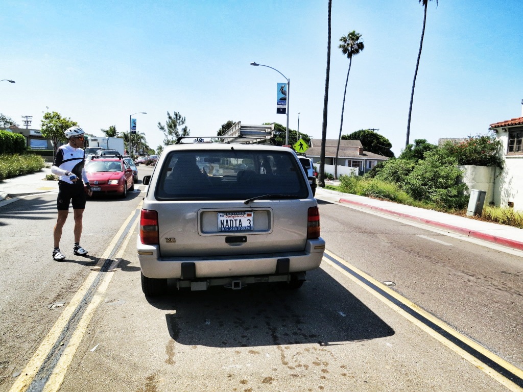 As we rode through Bird Rock roundabouts, one of the car drivers (driving a gray Jeep 4×4 with CA license plate “NADIA 3”), driving next/just ahead of Bernie and Larry, followed by Rick, was driving erratically, deliberately cutting them off by periodically getting his car to the far right, next to the curb, and effectively squeezing them off the road. Bernie was riding behind the car, and yelled at the driver to get his attention. The driver then proceeds to immediately slam on the brakes, forcing Bernie to crash into his rear window. There were no cars or obstacles ahead and no other obvious reasons for him to suddenly hit the brakes, except to deliberately crash a cyclist with malicious intent. Other drivers behind called 911 and the police was on the scene within just a few minutes. The Jeep drove off at first but turned around and came back to the scene of the accident. A lot of people stopped to offer help. This was behind me when this happened and I got a bit of a shock when I saw a descender lying in the middle of the road in my rearview mirror.
