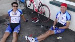 I did a quick u-turn and stopped with Yi-Shiou. I told him we could return back over Lake Wohlford or take a more direct route by staying on Valley Center and dropping into Escondido. We might even find Bob along the way. We decided to go the shortest route. I pulled him along and we looked for a bike at all the stores. Just before the turn at Lilac Yi-Shiou spotted Bob sitting against a wall of the Valley Center Oil Center. We both pulled into the parking lot.