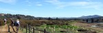 I had seen photos of Oleg and Mike from the Tuesday Skive Ride that went along the new trails of the estuary so I was not surprised when it looked like Mike was going to have us turn onto the trail. He unfortunately did not communicate well so his stopping surprised Todd who broke hard and surprised Jeff even more as he did not even brake until the last second. The result was a rear wheel collision that caused Jeff to fall from his bike. I was well to the rear and off to one side so I have plenty of proof that I was NOT involved in the fall. Jeff did a good job of mostly avoiding Todd and he even somewhat gracefully fell; no damage to any bike and only a knee scrape. No harm, no foul; we were quickly back on our way riding the dirt on the Coast to Crest trail. We crossed under I-5 and rode over past the Flower Hill Mall, eventually looped back toward the coast on Via De La Valle. Mike wanted to get us to Nardo Ave.