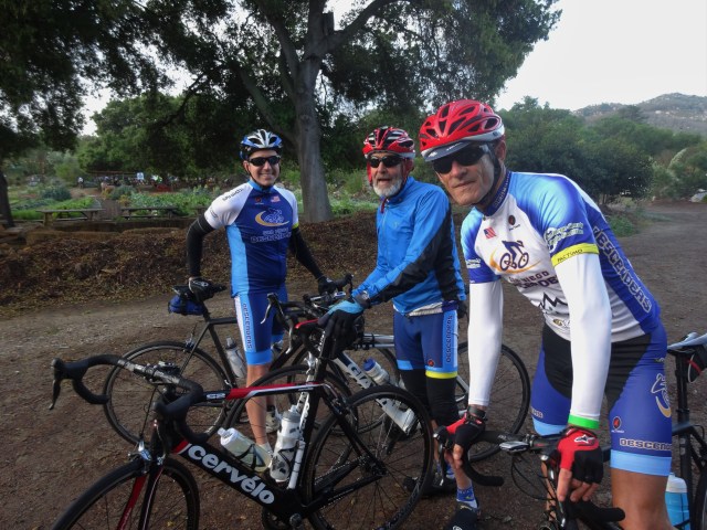 The much anticipated Palomar ride was tempered a bit by rainy weather during the week leading up to the event, along with snow above 4,500 feet on Palomar Mountain. This was a great group ride last year, so I had high hopes for another good Descenders turn-out this year. Unfortunately, schedules and the weather deterred some from riding. We still had 8 Descenders out for the event. Personally I had been under the weather due to a head cold gained when my daughter brought home three friends from college for spring break. They had a great time and shared lots of college germs. In any case, I almost decided to stay in bed as well. I met Len at the shopping center near my house so we car pooled over to Stone Farms. This is an out of the way location near the top of Jesmond Dene Road. It is full of green gardens growing kale and other food for the Stone Brewery. The muddy road up to the start area opened a bit to a field of parking for us VIP’s–car-poolers. Len and I got our numbers and did final prep to ride. We caught up with the rest of the guys at the start line. All except Quoc. He does not have a Descenders kit yet, so I did not see him. It was chilly and likely not to get much warmer. I managed to take one photo of Larry, Jim and Len before we got to the start line. It was too cold and I was too sick to take more photos.