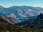 We all rode into Alpine and met up with John at the store. After a short break we were preparing to head back when Andrew noticed his tire was flat. John and Len decided to ride while the rest of us fixed the flat on Andrew’s bike. We rolled out and had not made it back to Olde Highway 80 when we came upong Len and John. John was attempting to shorten his chain to convert his bike into a fixie. His rear derailleur lower pulley had just fallen off, lost on the road somewhere. It looked to be a bit of a major rework so they were planning to call for a ride home. The four remaining riders–Neil, me, Bernie and Andrew–decided to start the ride back towards the 67 climb. We bid adieu to Neil at El Capitan HS and we were down to three. Andrew and Bernie pulled me along Moreno Ave to the start of the climb. I told them not to wait. I pedaled slowly up the climb and watched them get farther and farther ahead. I did stop for a nice view of San Vicente Reservoir and took a photo.