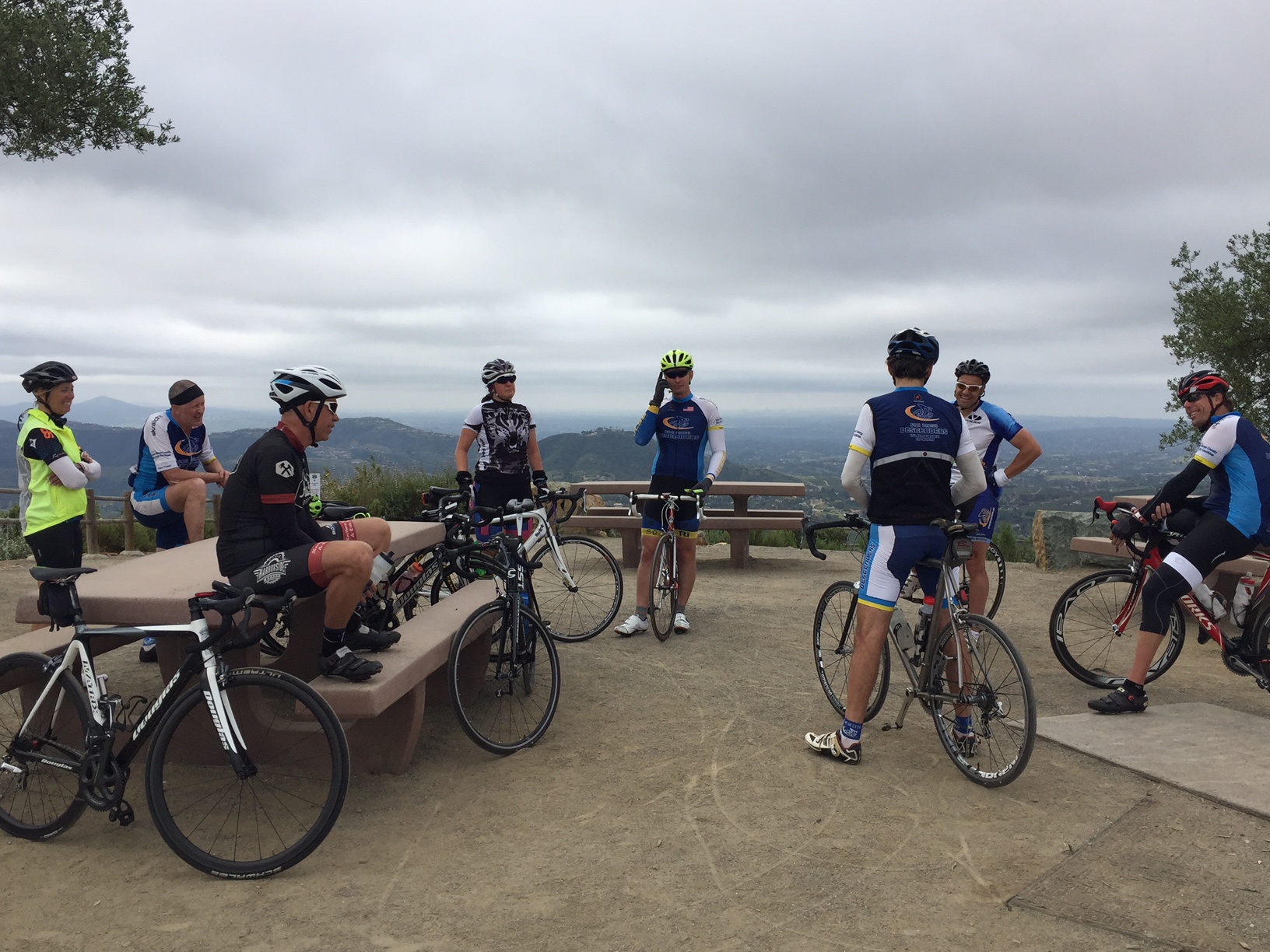 It was a nice, cool, cloudy morning as the group met at the corner of RB/Pomerado. Included were Andrey, Marissa, Rick W, Garet, his fast friend Justin, Claus, John M and Tony. Across the stunningly beautiful Lake Hodges, still with grown trees in the middle of a lake and lovely reflections. Pleasant pace up Valley Parkway to Bernardo where it was a little spirited up the hill, then skirting construction used an alternate route around a gate and headed to Elfin Forest. Seemingly appearing out of the heavens, Hodges was present before the cruise through the forest where Garet and Rick paced us until Rick melted his tire tube from the speed and flatted. Lots of mountain bikers in an organized race/ride coming our way. Painful ascent to town of Elfin Hills courtesy of Rick W. Hodges and others may have gone up Questhaven. Regroup and on our way to Double Peak with Rick W, Garet and Justin digging deep. Bill Braamse and his wife Peggy were already at the top, group took a break then said goodbye to Justin and Garet and headed to RSF. Onto Stud Loop where HODGES CAME ALIVE (after whining about "hurty knee" "don’t wait for me, hurty knee"). He and Bill were way out front of the group, Rick W and Claus also showing their strength. Just to show it wasn’t a fluke, Hodges trailed only Bill and Rick, heading up 3 Witches. The group left Claus to go get his 115 miles/8k feet at Camino Del Sur and the rest followed Bill north on CDS, to a quieter route through 4S to West Bernardo where more splits occurred as the group headed home. Yet another great day on the bike in San Diego.