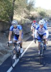 Despite the weather, we had a hardy crew of 9 Descenders ready to ride. Beside Ernst and Sheehan, Guido and Bernie; we had Hodges, Geoff B, Zach and a young rider Bernie met on the recent Everest Challenge, Scott Coiner. Scott is a senior at Poway HS and a strong young rider. I made the 9th Descender rider. The Ranchos turn-out was even more bleak; they only had 5 riders show. Matt and Jordan Baab, along with three others. They rolled to our group and we decided to rider together for the first part of the ride. Matt was planning a loop past Harrahs Casino and up Cole Grade. He tried to get us to join them but our group seemed locked into Couser.